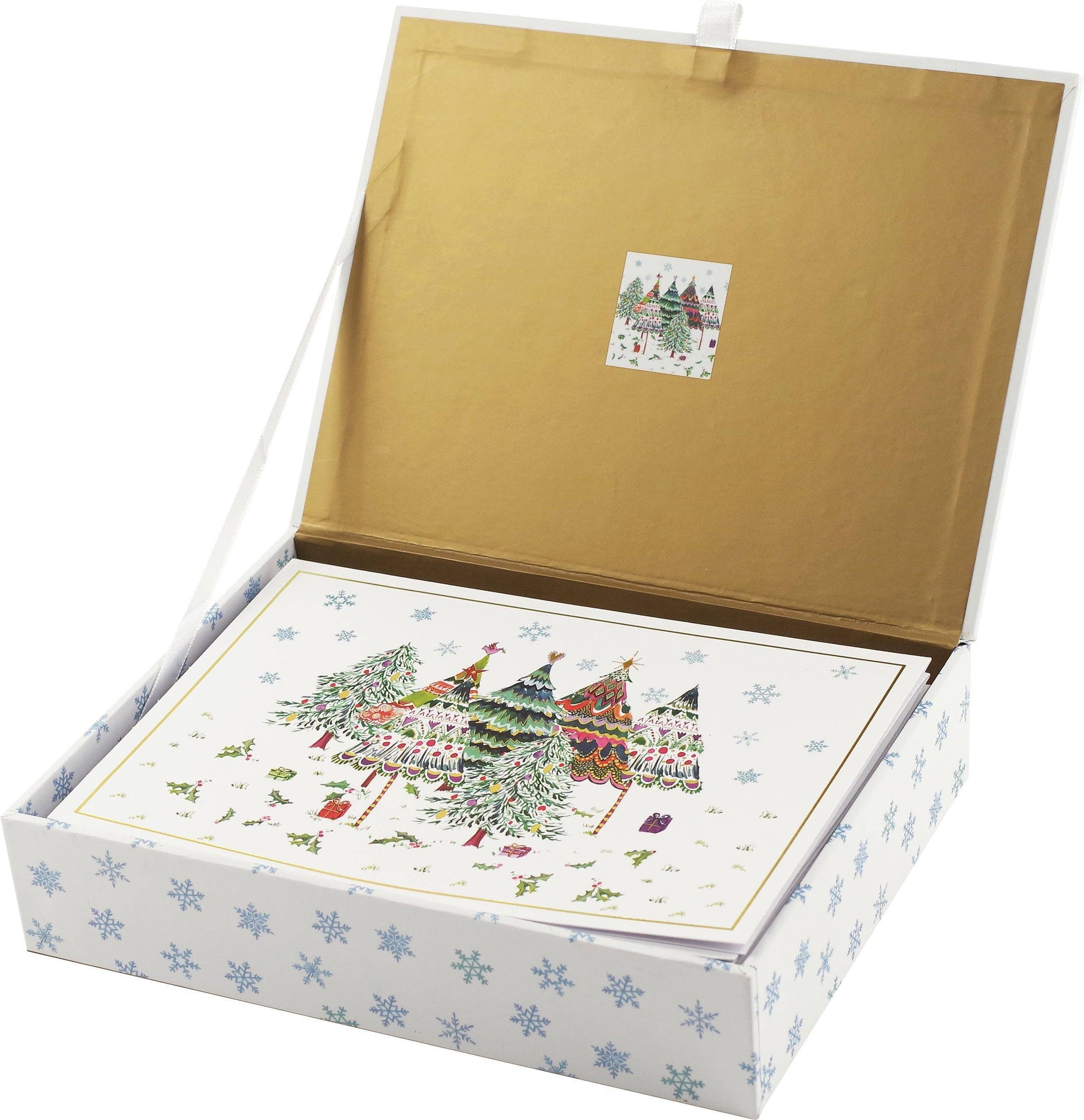 Vibrant greeting cards feature a snowy copse of colorfully decorated Christmas trees, surrounded by boughs of holly. Premium card set includes 20 cards, 21 envelopes, and a matching keepsake box. Larger cards provide ample space for personal messages. Cards measure 7'' wide x 5'' high. Smooth card interiors are uncoated. Quality card stock supports a variety of pens. Flecks of gold foil illuminate the image. Inside greeting: Season's Greetings White stationery envelopes are self-sealing for your convenience -- simply peel and stick. Sturdy reusable box features a reproduction of the card design on the lid. A smaller image is replicated inside. Box comes with a ribbon tab, ribbon hinge, and a magnetic closure. Perfect for storing notes, holiday mementos, postage stamps, and more!